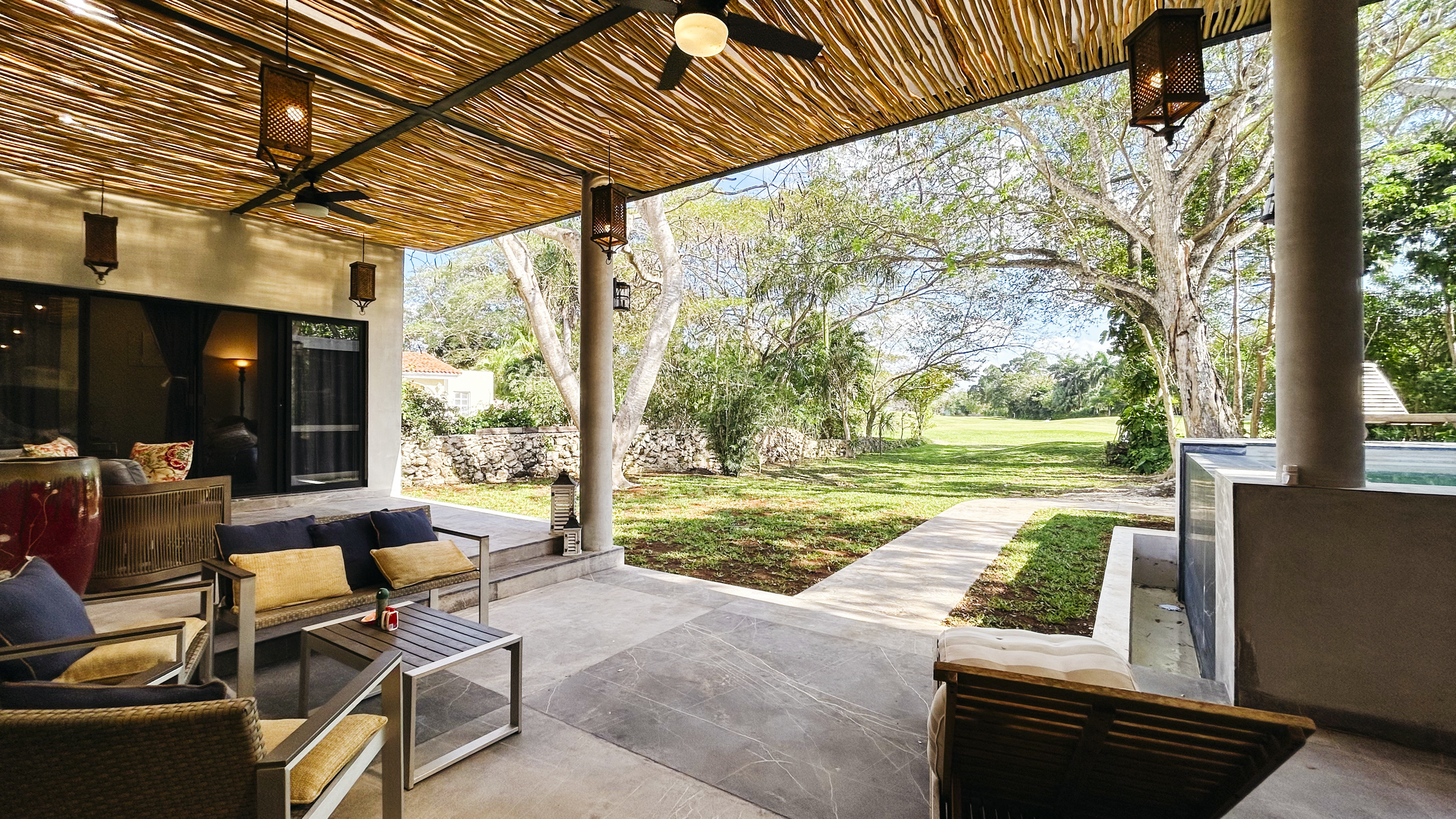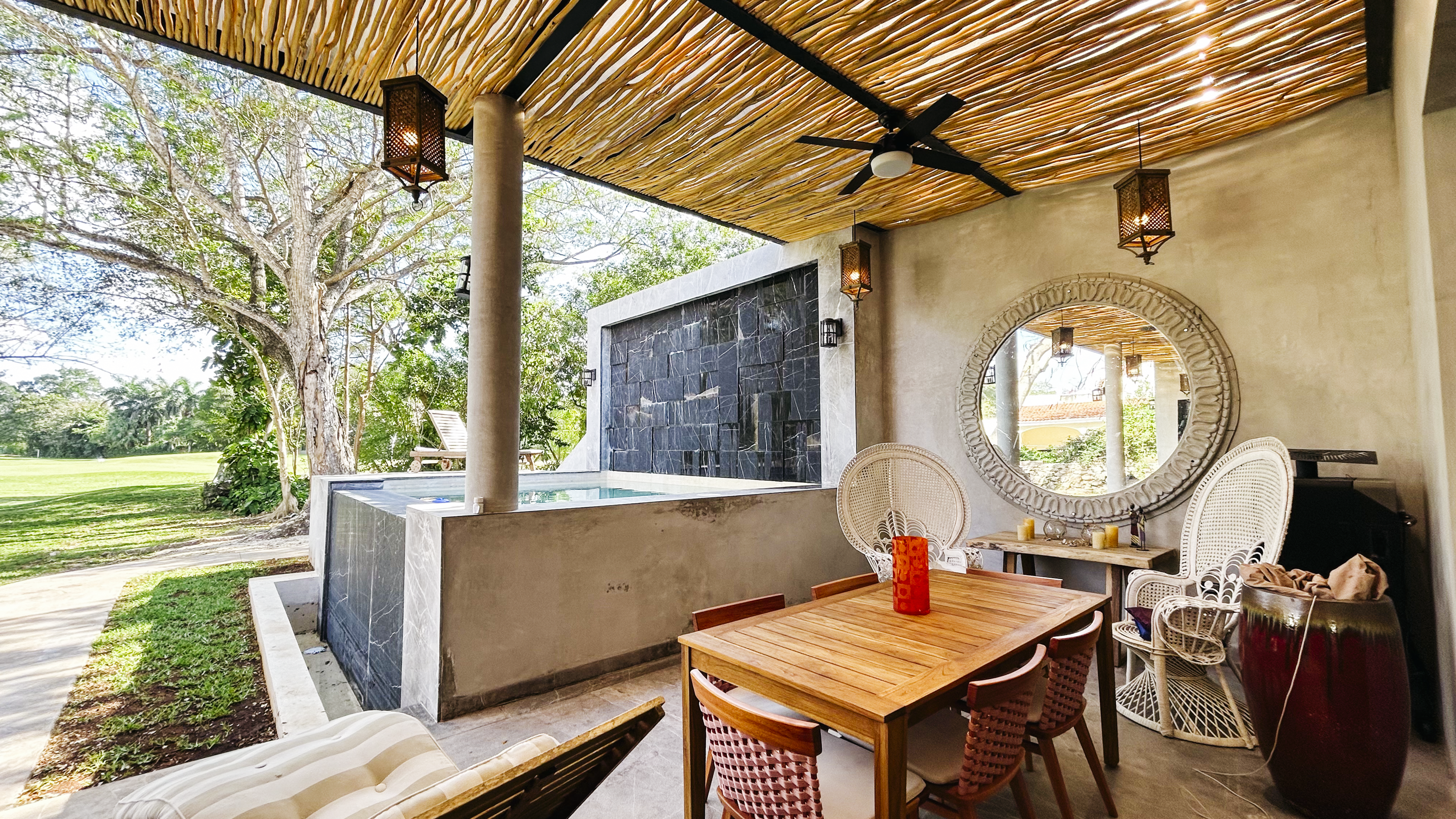 – Alberca cubierta de mármol martelinado y con diseño en cascada en mármol negro