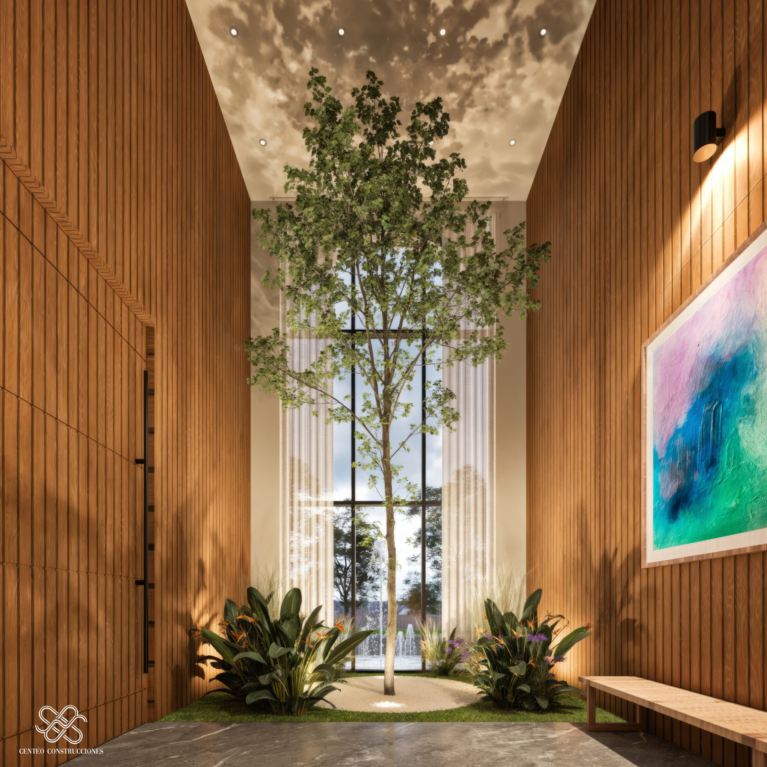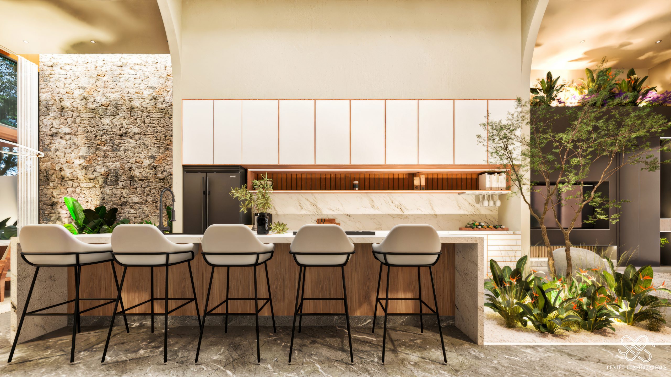 interiores, detalles en en piedra maya, lambrines y celosía de madera de ingeniería