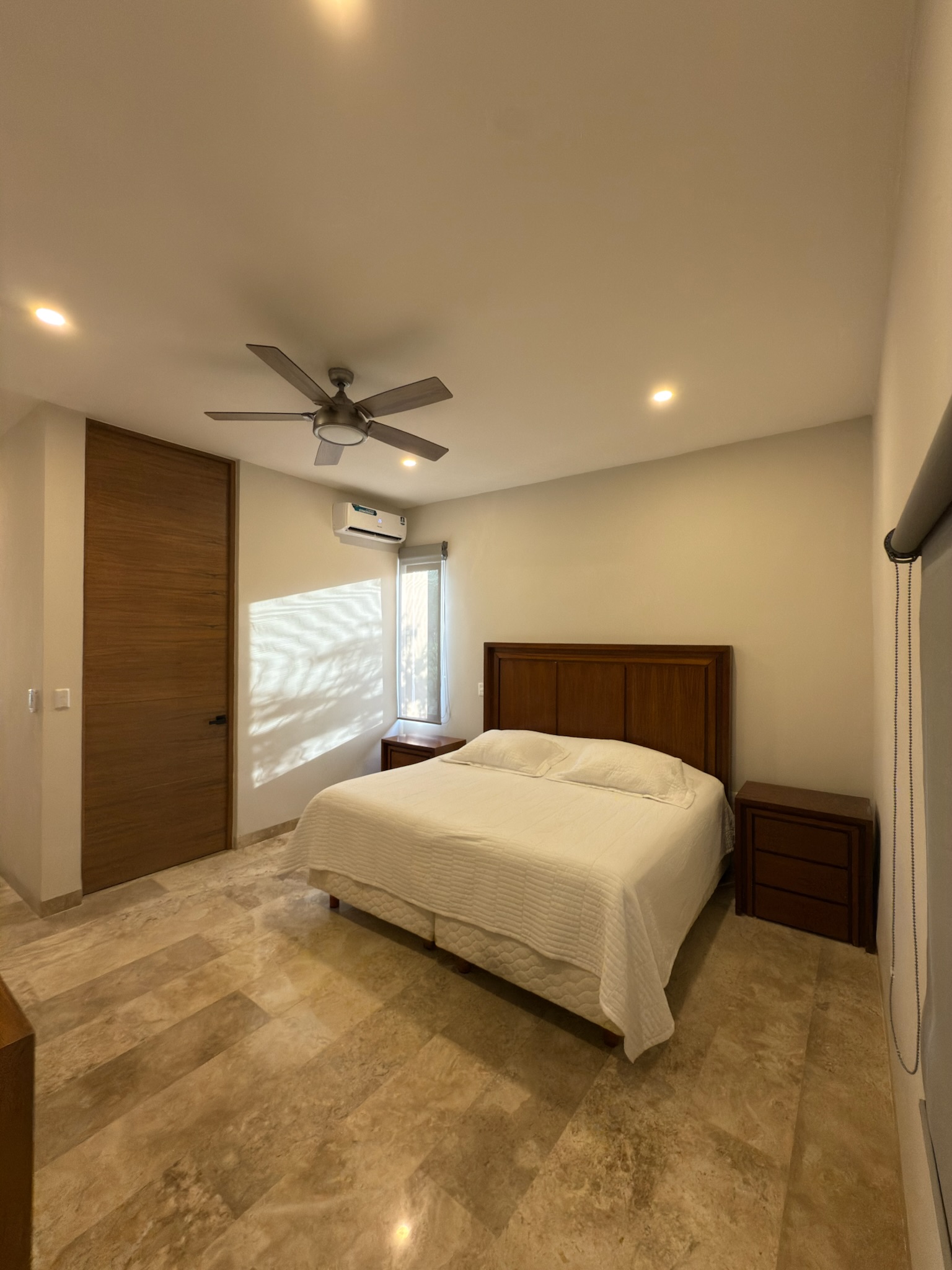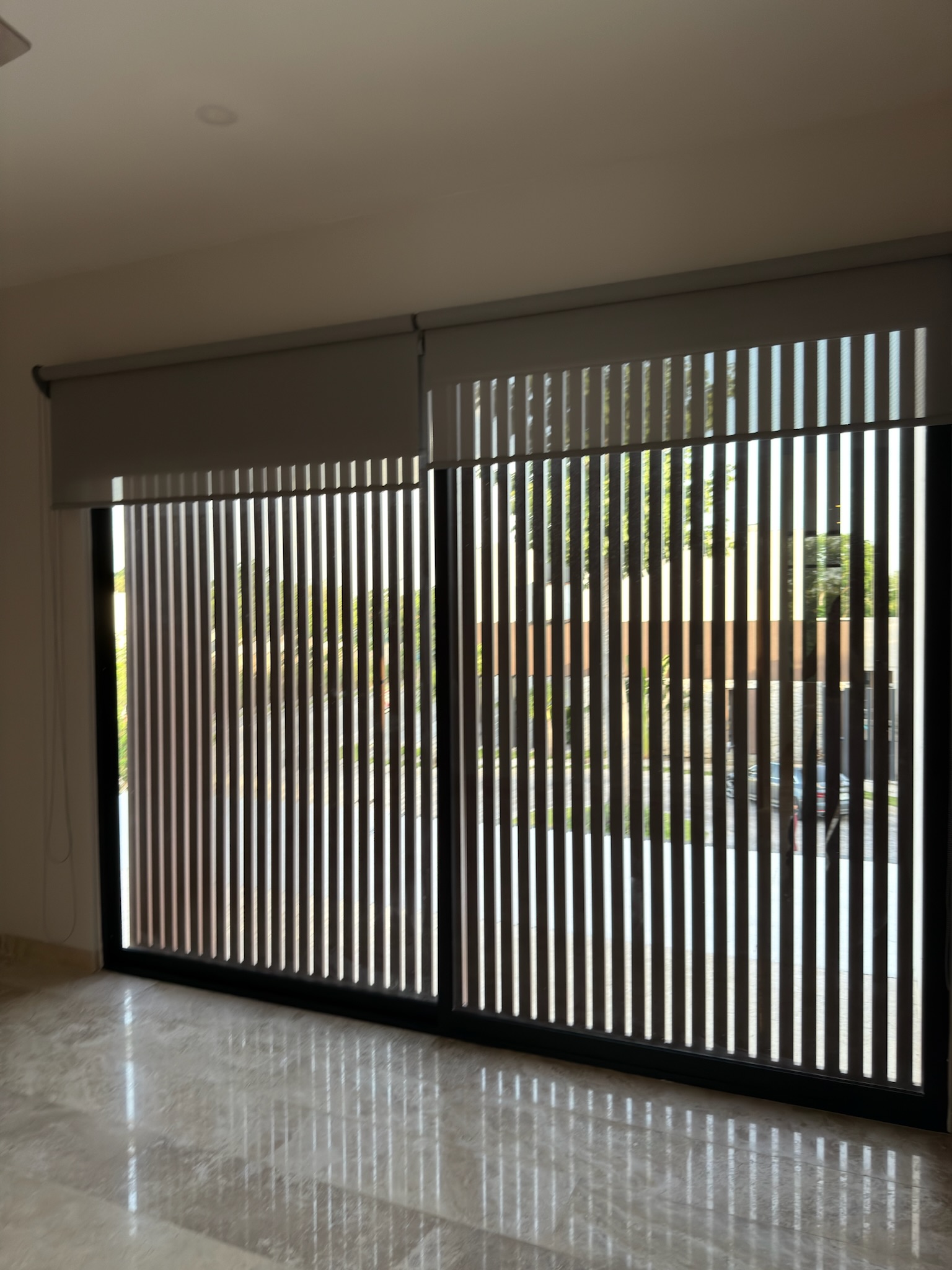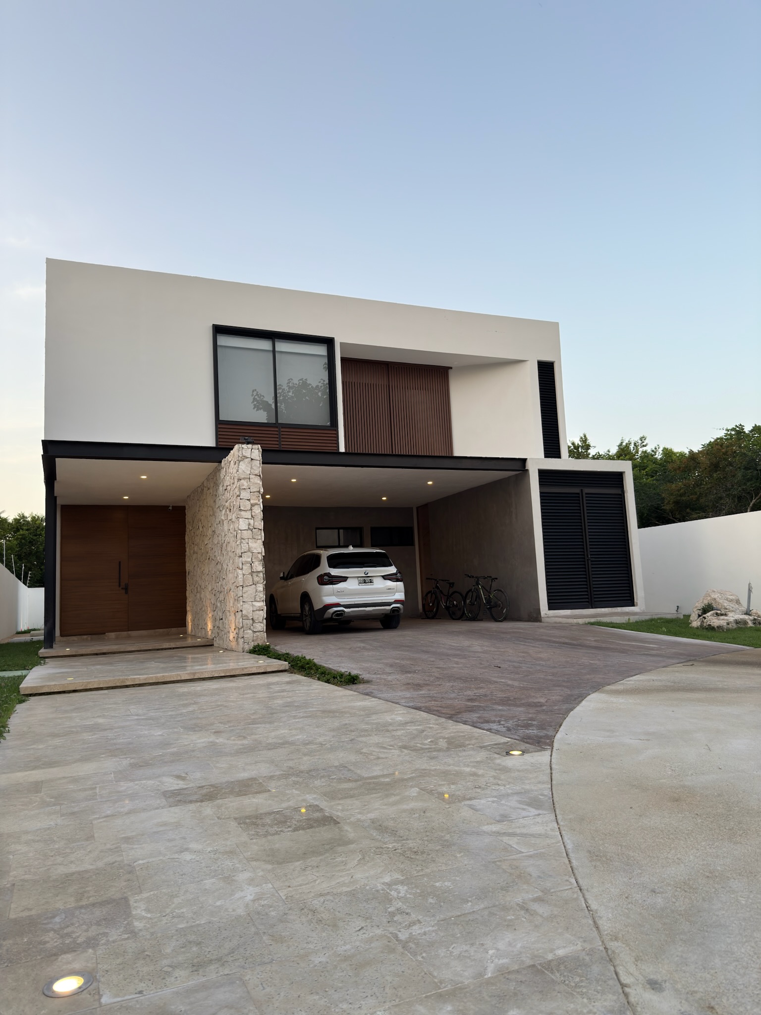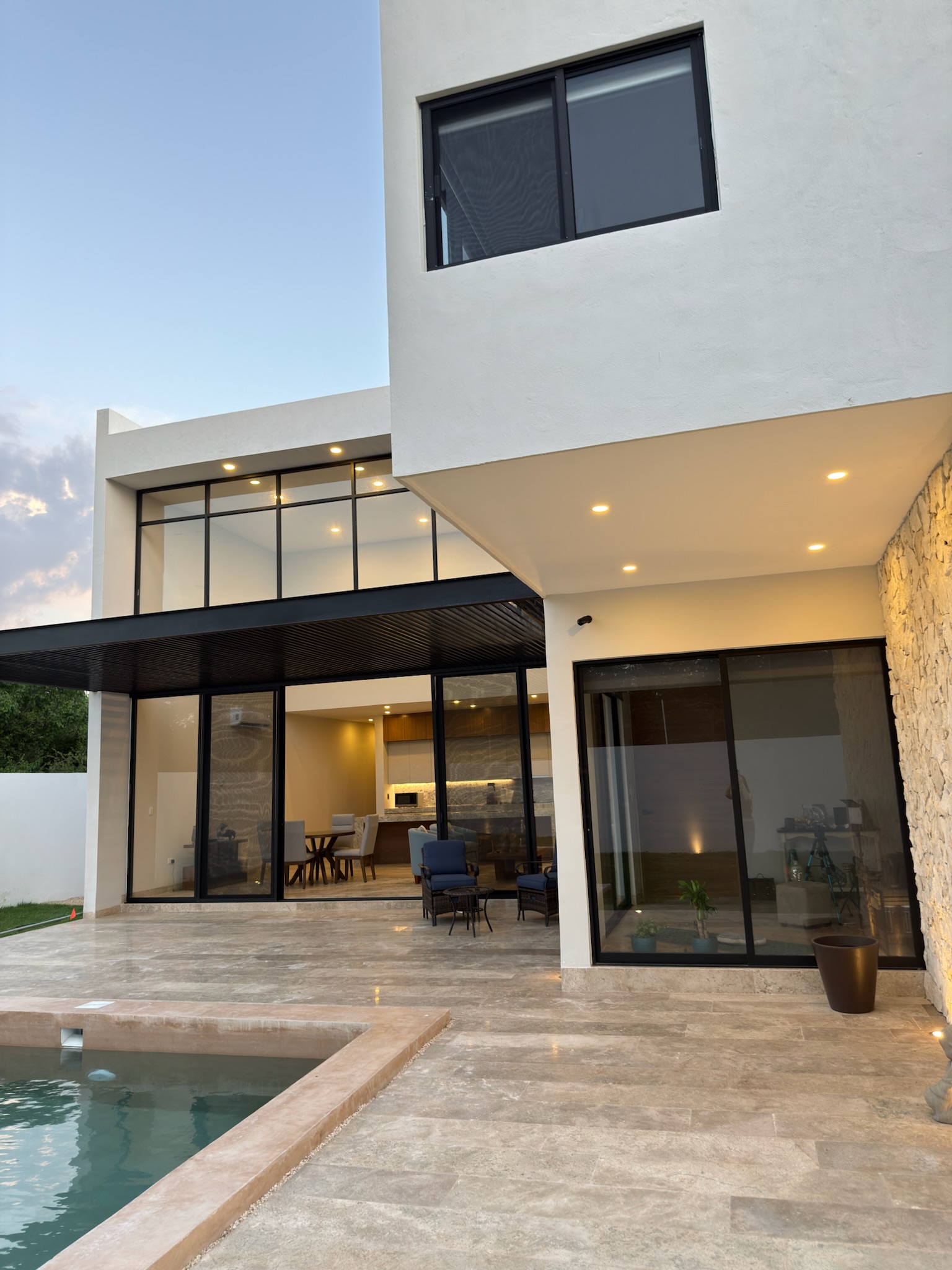 Residencia con amplios ventanales que aportan luz natural y conectan interior con exterior. Fachada en tonos claros con piedra natural, terraza techada, piscina y jardín.