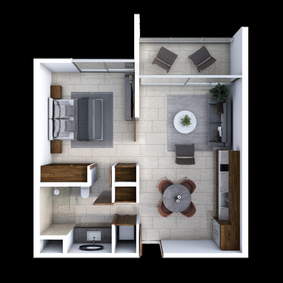 Este proyecto cuenta con departamentos de 1 y 2 recámaras, el departamento de 1 recámara cuenta con 1 baño completo.
