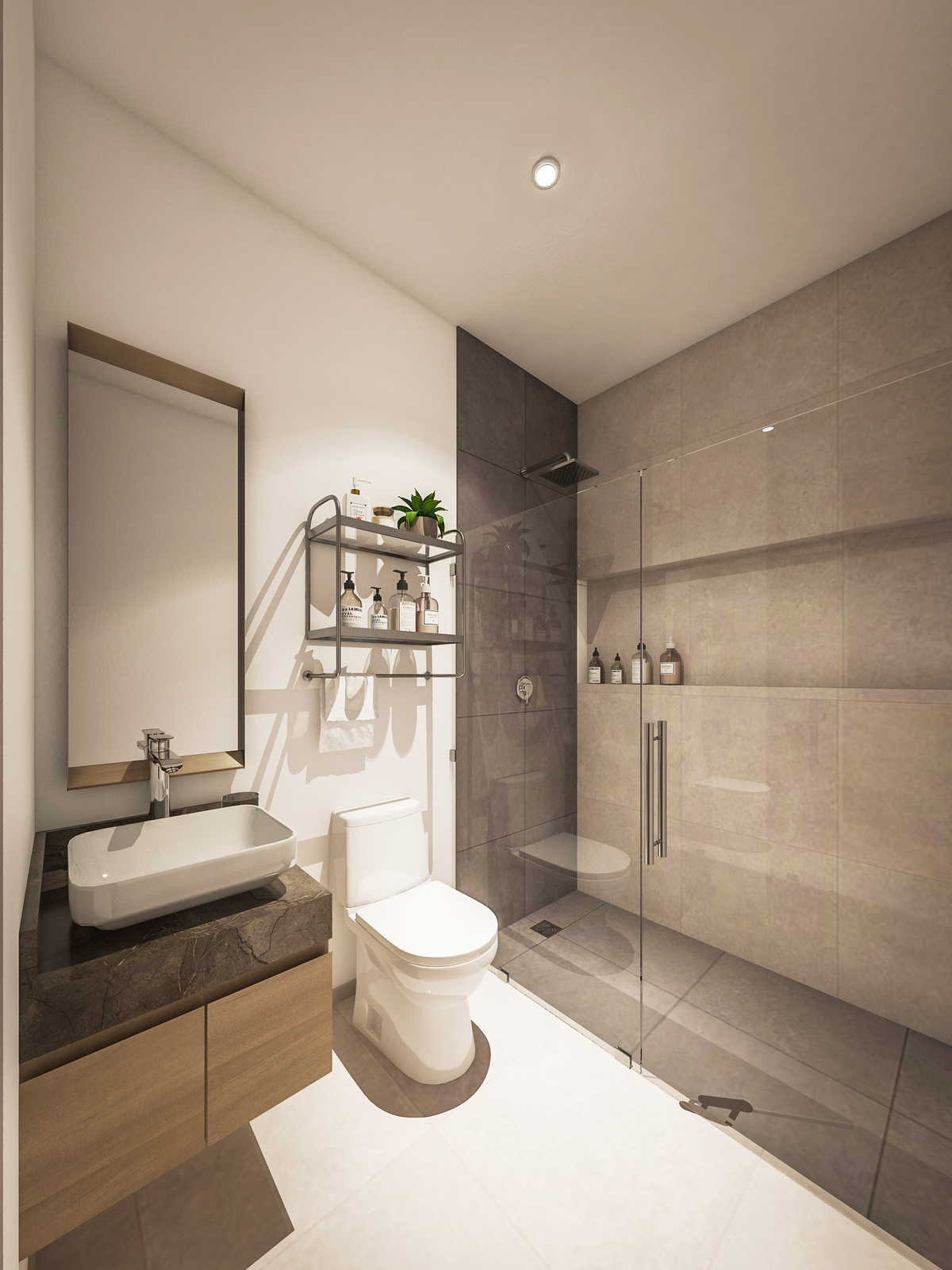 Este proyecto cuenta con departamentos de 1 y 2 recámaras, el departamento de 1 recámara cuenta con 1 baño completo.