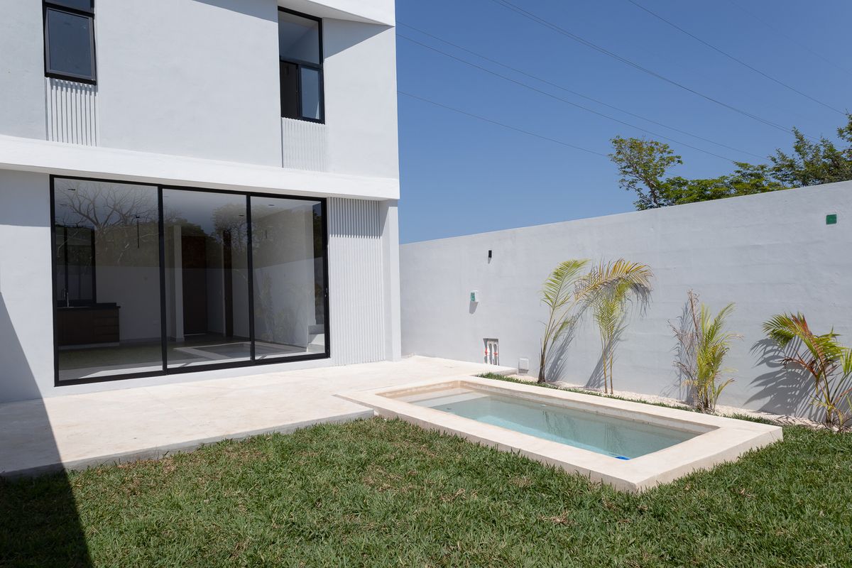 Cuenta con 3 recámaras, uno en planta baja y 2 en primer nivel, 3 baños 1/2, Garage para 2 vehículos, Piscina.